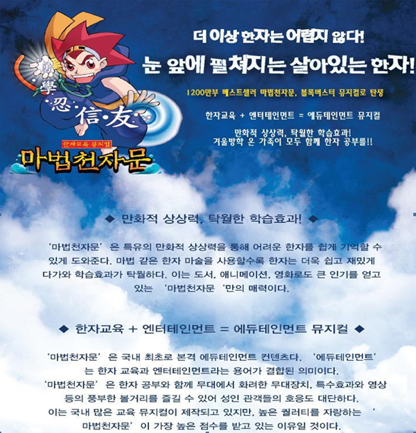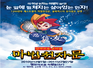[공연개요] 공 연 명 : 한자교육 뮤지컬 ‘마법천자문’ 공 연 일 : 2010.12.01~2011.02.27 공 연 장 : 명보아트홀 하람홀(6F) 공연시간 : 화~목 2시, 4시 / 금 4시, 8시 토, 일, 공휴일 2시, 4시 / 월요일 공연 없음 관람시간 : 70분 관람등급 : 전체관람가 티켓가격 : 전석 30,000원 (24개월 미만 무료입장) 문 의 : 02-2274-2121 제 작 : 명보아트홀, 초록공간문화기획단