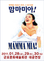 - 공 연 명 : 뮤지컬 맘마미아! - 군포 - 공연일정 : 2011년 1월 28일(금)~30일(일) - 공연장소 : 군포시문화예술회관 대공연장 - 티켓가격 : VIP석 120,000원 / R석 100,000원 / S석 80,000원 / A석 60,000원 [기획사정보] - 주최 : 군포시문화예술회관 - 주관 : (주)하늘이엔티