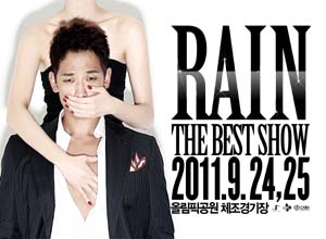 [공연정보] - 공 연 명 : 2011 RAIN THE BEST SHOW - 공연장소 : 올림픽공원 체조경기장 - 공연일자 : 2011년 9월 24일(토) ~ 25일(일) - 공연시간 : 토요일 17시 / 일요일 17시 [기획사정보] - 주최 : 제이튠캠프, CJ E&M㈜, 카바 엔터테인먼트 - 주관 : CJ E&M㈜, 카바 엔터테인먼트 - 문의 : 클립서비스 1577-3363