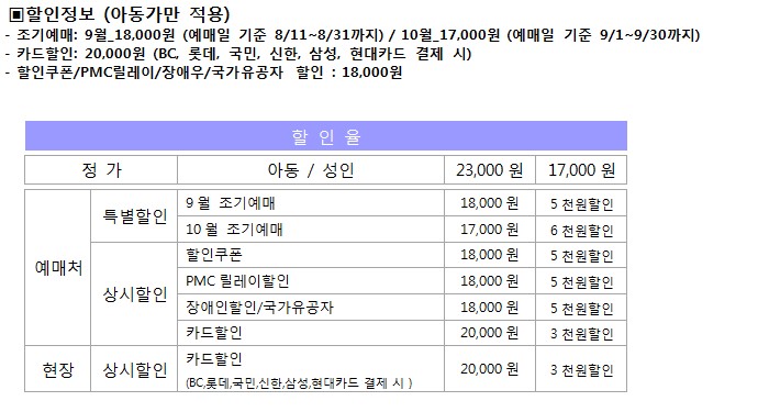 - 티켓가격: 아동 23,000원 / 성인 17,000원(성인 할인 없음)