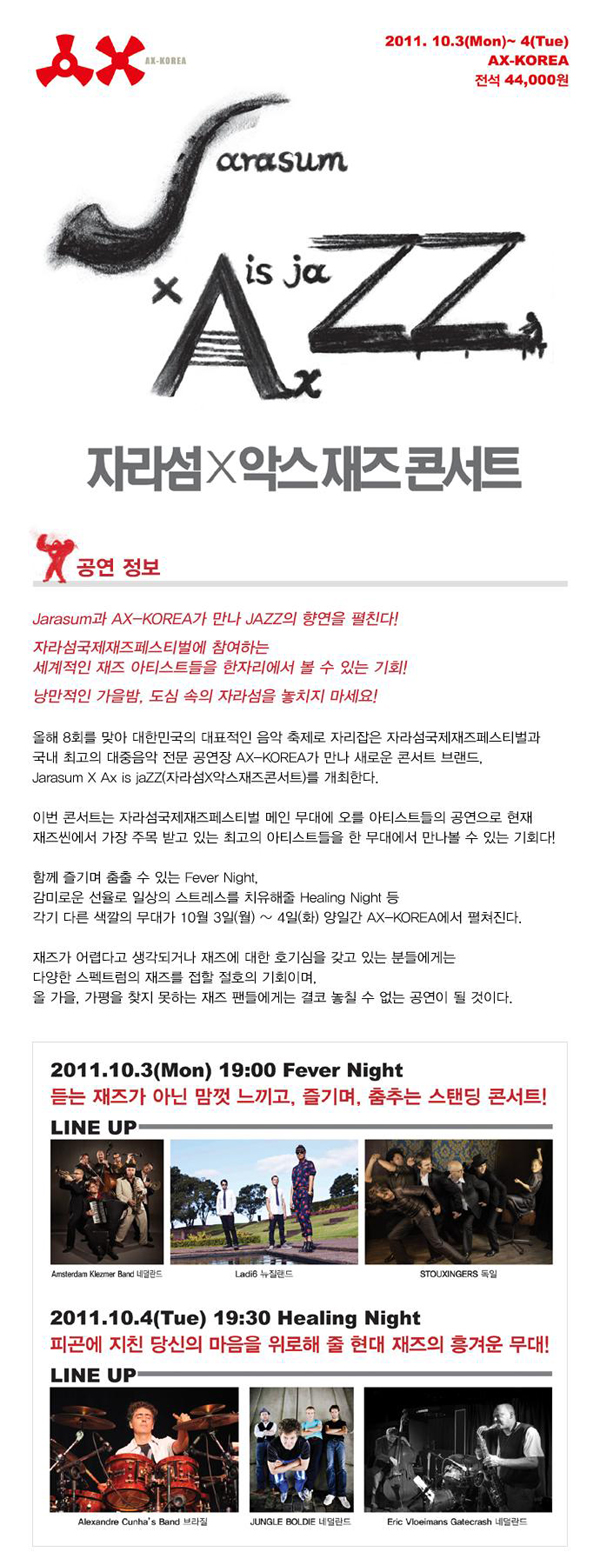[공연정보] 공연 기간 : 2011.10.3(월) ~ 10.4(화) 공연 시간 : 10.3(월)19:00 / 10.4(화)19:30 공연 장소 : AX-KOREA 티켓 가격 : 44,000원 [기획사정보] 주최 : 씨쓰리엔터테인먼트 주관 : 씨쓰리엔터테인먼트 문의 : 02-3445-9650