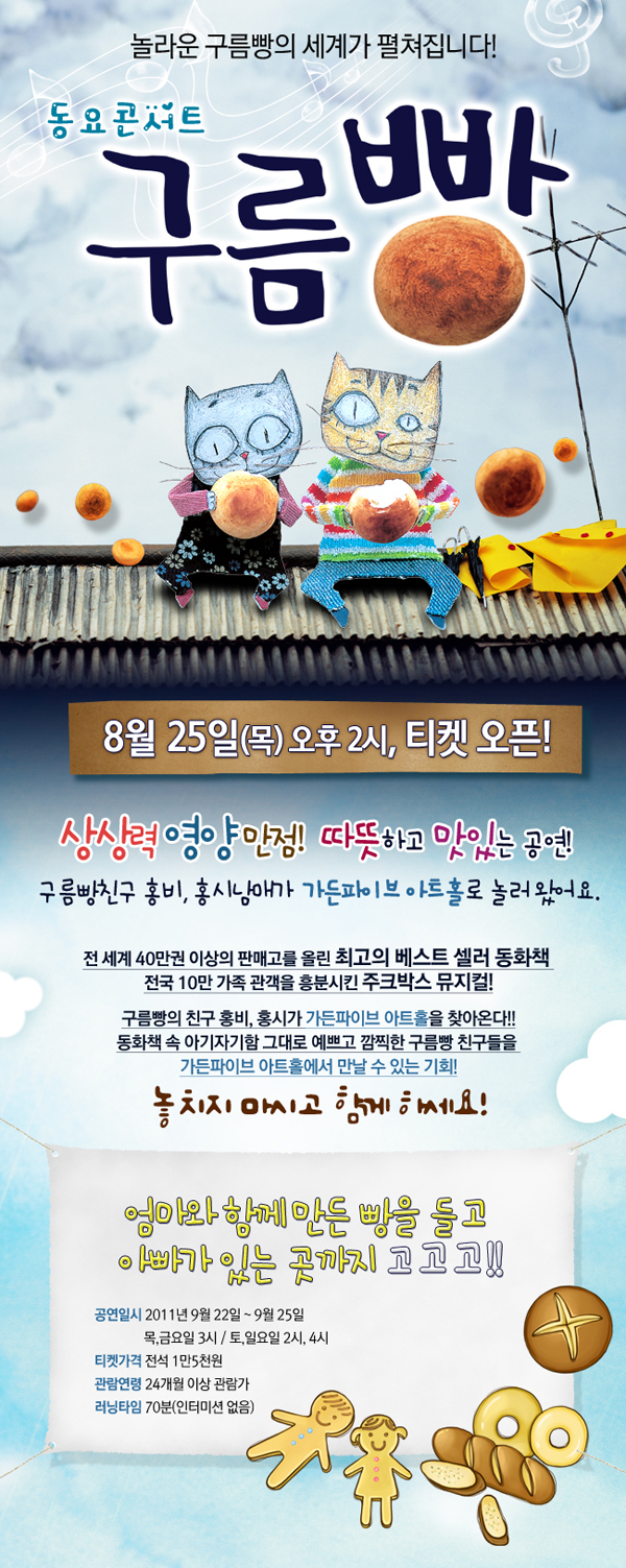 [Booking Information] 공연일시 : 2011년 9월 22일~9월 25일 목,금요일 3시 / 토,일요일 2시, 4시 티켓가격 : 전석 1만5천원 관람연령 24개월 이상 관람가 러닝타임 70분 (인터미션 없음)