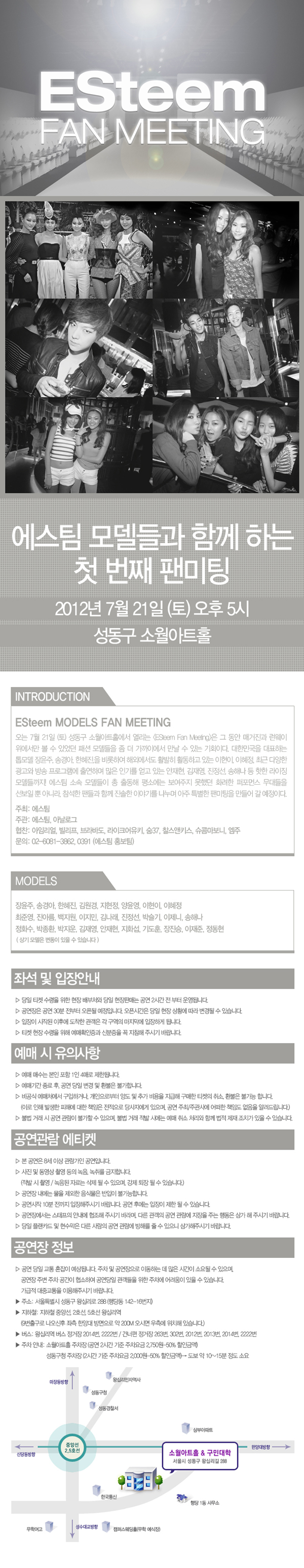 7월 21일(토) 소월아트홀에서 열리는 <에스팀 모델 팬미팅>은 콘서트 형식으로 숨겨진 모델들의 끼를 볼 수 있는 화려한 퍼포먼스뿐 아니라 그 동안 매거진, 런웨이 위에서만 볼 수 있었던 패션 모델들을 직접 만나 그들의 진솔한 모습을 볼 수 있는 최초의 기회다.