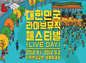 오는 9월 1일~2일 이틀간 난지한강공원 내 젊음의 광장에서 “2012 대한민국 라이브뮤직 페스티벌”이 펼쳐진다. “라이브데이”라는 부제와 함께 2012년에 본연의 타이틀로 돌아온 “대한민국 라이브뮤직 페스티벌”은 서울 도심 속에서 즐길 수 있는 음악페스티벌의 원조 격으로 올해 7회째 맞이한다. 매회 100여 팀의 뮤지션이 참여해 큰 화제를 모으고 있으며 “착한가격”으로 큰 주목을 받고 있다.