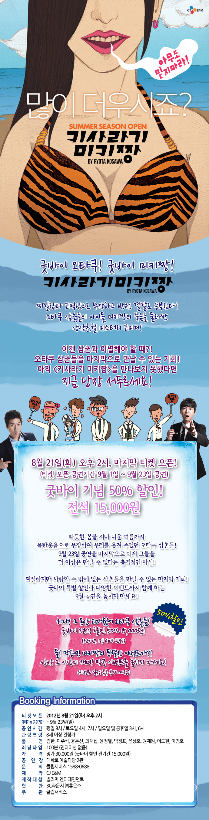- 공연시간 : 평일 8시 / 토요일 4시, 7시 / 일요일 및 공휴일 3시, 6시