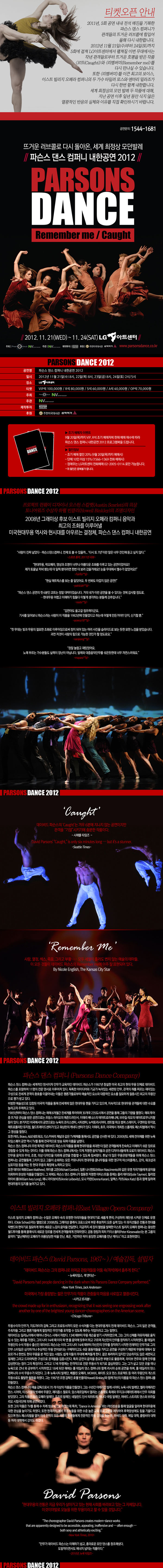 [공연정보] 공연명: 파슨스 댄스 컴퍼니 내한공연 2012 공연일: 2012.11.21 / 11.22 / 11.23 / 11.24 ( 4일 총 5회) 공연장: LG아트센터 [기획사정보] 주최: 팬텀에비뉴㈜, ㈜뉴벤처엔터테인먼트 주관: ㈜뉴벤처엔터테인먼트 제작투자: ㈜미시간벤처캐피탈 후원: 주한 미국대사관, 삼익악기㈜
