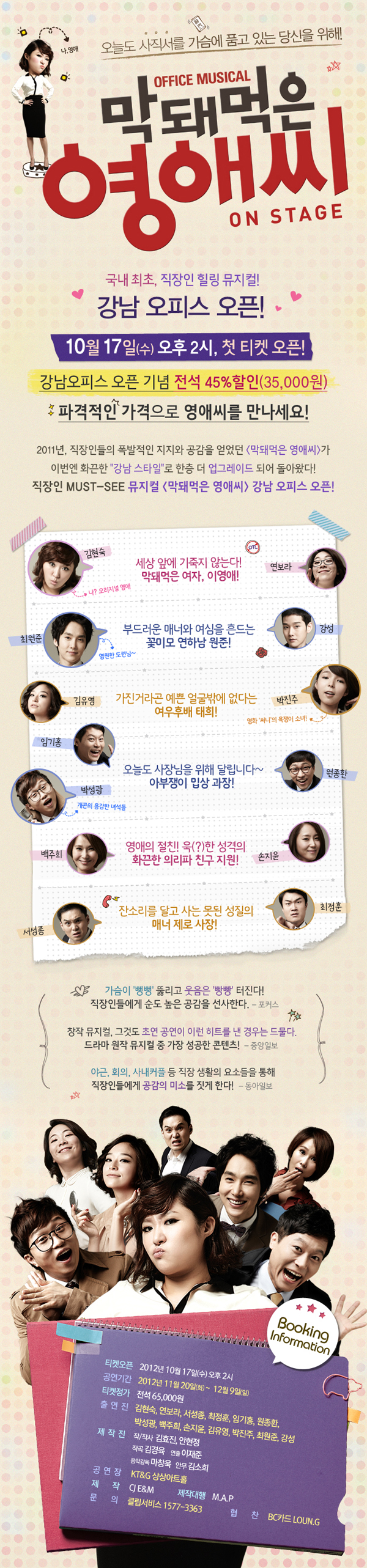 공연기간 2012년 11월 20일(화) ~ 12월 9일(일) 티켓정가 전석 65,000원 출연진 김현숙, 연보라, 서성종, 최정훈, 임기홍, 원종환, 박성광, 백주희, 손지윤, 김유영, 박진주, 최원준, 강성 제작진 작/작사 김효진, 안현정 / 작곡 김경육 / 연출 이재준 / 음악감독 마창욱 / 안무 김소희 공연장 KT&G 상상아트홀 제작 CJ E&M 제작대행 M. A. P 문의 클립서비스 1577-3363 협찬 BC카드 LOUN.G