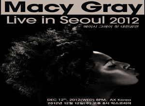 독특한 보이스, 뛰어난 개성과 실력으로 네오 소울 계에 독보적으로 자리매김을 하고 있는 메이시 그레이가 오는 12월 12일 (수), 서울 악스 코리아홀(Ax-Korea)에서 첫 내한공연을 갖는다. 데뷔 이래 전 세계 2500만 장의 앨범 판매고를 기록한 메이시 그레이는 이번 내한공연을 통해 처음으로 국내 팬들을 만날 예정이다.