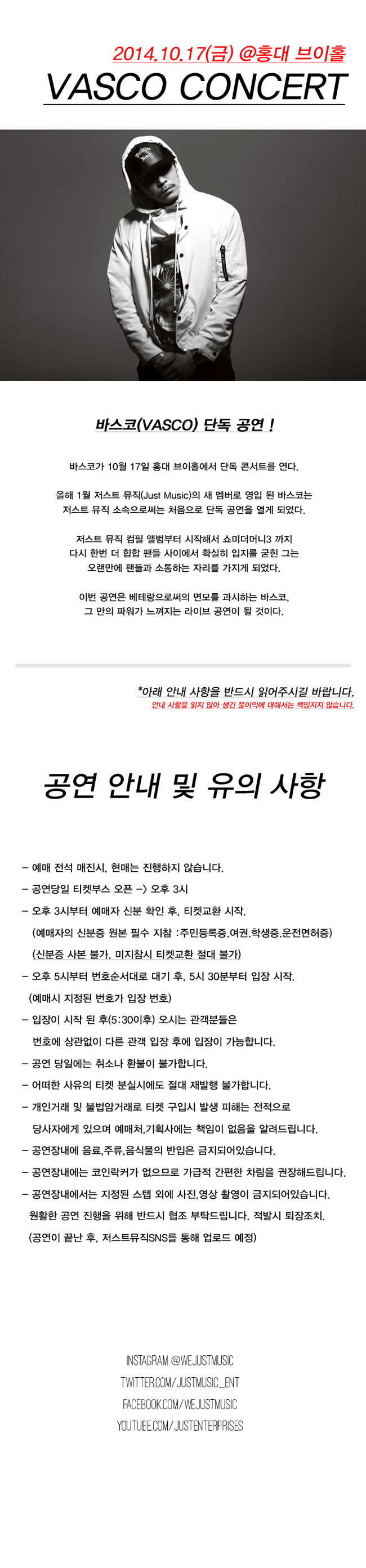 공연명 : VASCO CONCERT 일시: 2014년 10월 17일 (금) 오후 6시 장소: 홍대 브이홀 티켓: 예매 25.000원 / 현매 30.000원 (예매 매진시, 현매 진행 없음) 공연 관람 등급 : 15세 이상