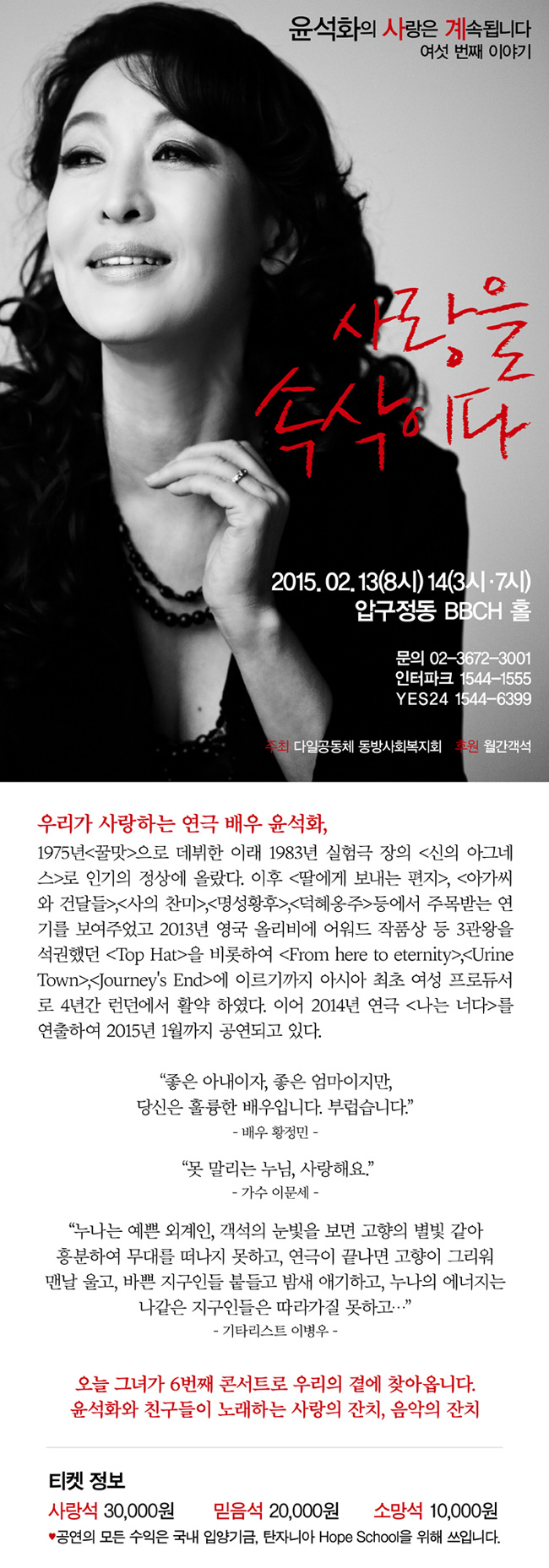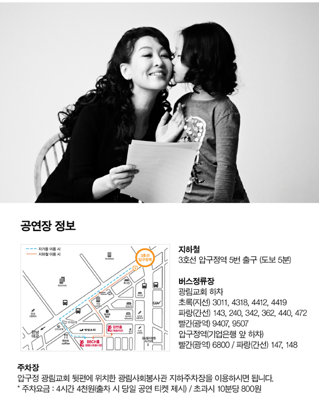 공연 기간 : 15년 2월13일금 8시 / 15년 2월14일토 3시 7시 공연 시간 : 100분 공연 장소 : BBCH HALL 티켓 가격 : 믿음석 30,000/사랑석20,000/소망석10,000
