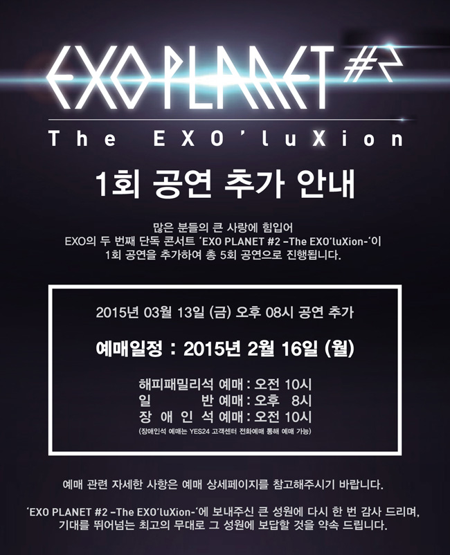 EXO PLANET #2 - The EXO’luXion - 1회 추가 공연 티켓 오픈 안내입니다.