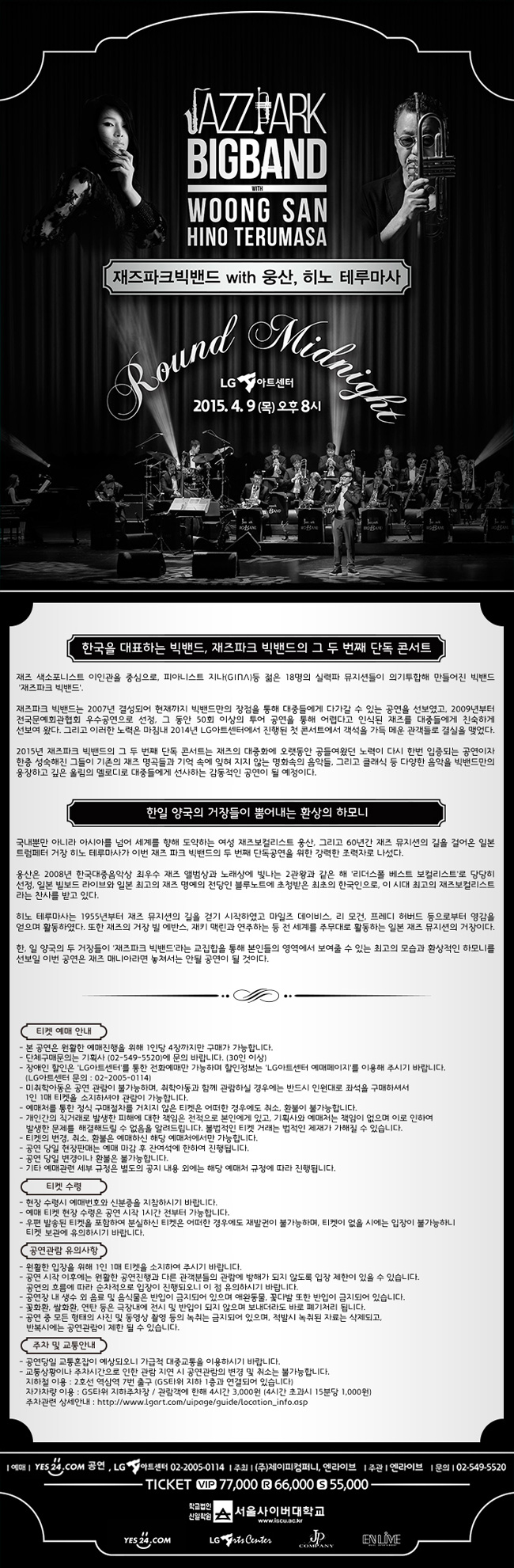 공연 기간 : 2015년 04월 09일 (목) 공연 시간 : PM 8:00 공연 장소 : LG아트센터 티켓 가격 : VIP 77,000원 / R석 66,000원 / S석 55,000원 (기타 : 미취학아동 입장 불가 / 단체구매문의 : 02-549-5520