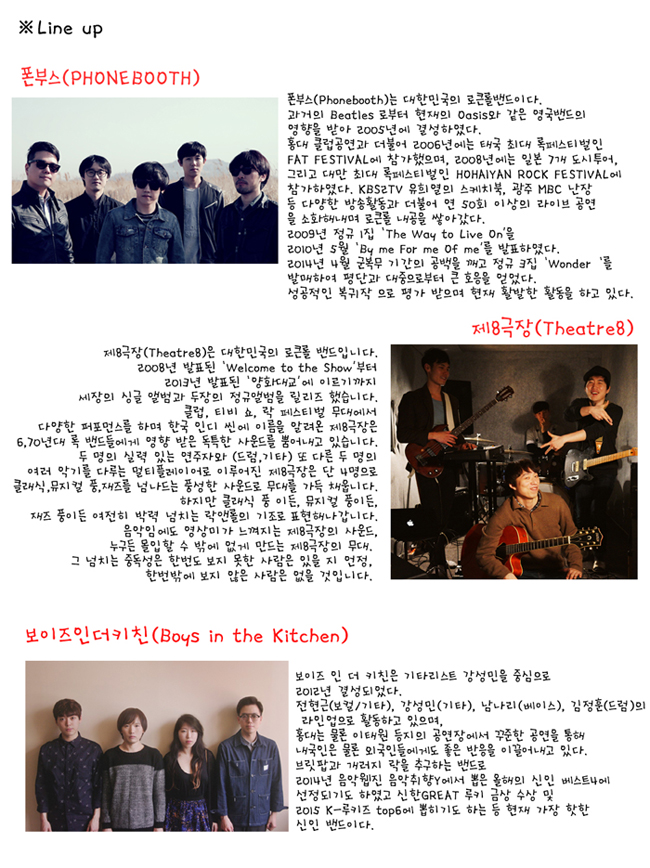 - 공연 시작 후 입장은 스태프의 안내에 따라 입장하실수 있으며 이에 따른 환불은 불가합니다.