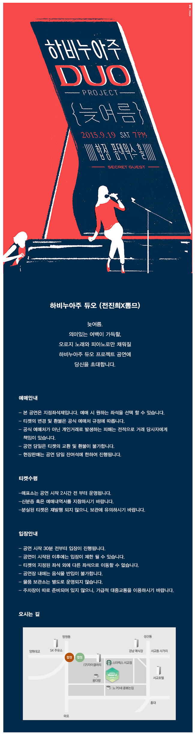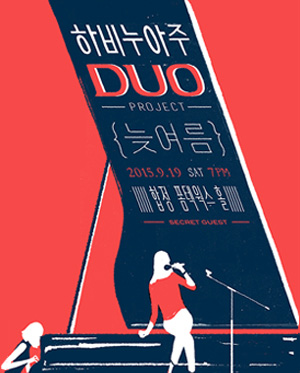 공연 제목 : 하비누아주 듀오 프로젝트 공연 [늦여름] 공연 기간 : 2015. 9. 19. 토 공연 시간 : 저녁 7시 공연 장소 : 합정 폼텍 웍스 홀 티켓 가격 : 예매 30,000 현매 35,000
