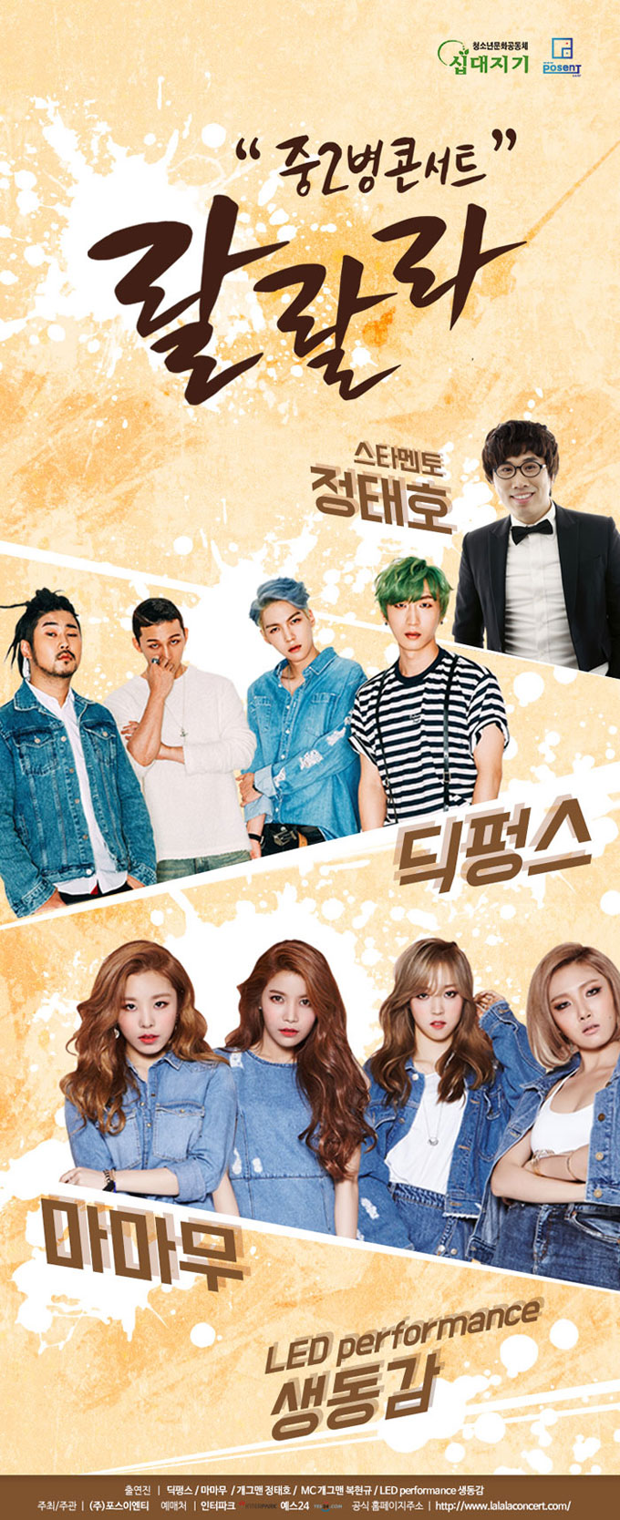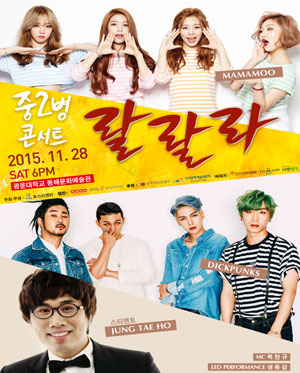 G랄도 발랄도 하여라! 중2병콘서트 랄랄라 실력파 대세 걸그룹 마마무와 VIVA청춘 싱그러운 밴드 딕펑스의 공연!개그콘서트 "용감한녀석들" 개그맨 정태호가 들려주는 중2병, 사춘기에 관한 힐링메세지!음악과 강연, 관객이 함께 어우러지는 중2병콘서트 랄랄라 놓치지마세요!