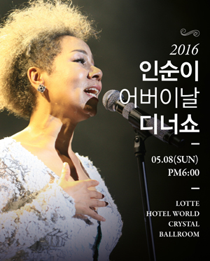 2016년 어버이날 “명품 뮤지션 인순이”가 편리한 교통과 아름다운 석촌호수의 경관을 자랑하는 롯데호텔월드 크리스탈볼룸에서 품격 있는 무대를 선보입니다.