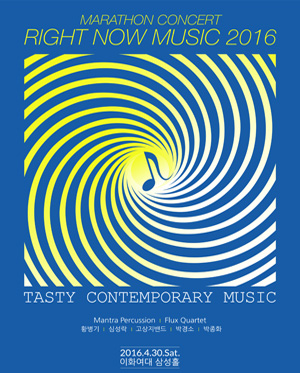 ‘통영국제음악제’, ‘서울시향 아르스 노바’ 와 함께 주목해야 할 대한민국 현대음악 3대 페스티벌로 자리매김한 ‘Right Now Music 2016 마라톤 콘서트’ 가 오는 4월 30일 이화여자대학교 삼성홀에서 개최된다. 지난해 4월 문화역서울284에서 제1회 ‘Right Now Music 2015 마라톤 콘서트’ 를 1천 5백명 이상의 유료 관객을 동원하며 성공적으로 개최한 것에 이어 올해에는 ‘Tasty ! Contemporary Music’ 이라는 주제로 동시대에 살아있는 생생한 음악을 다시 한번 들려준다.