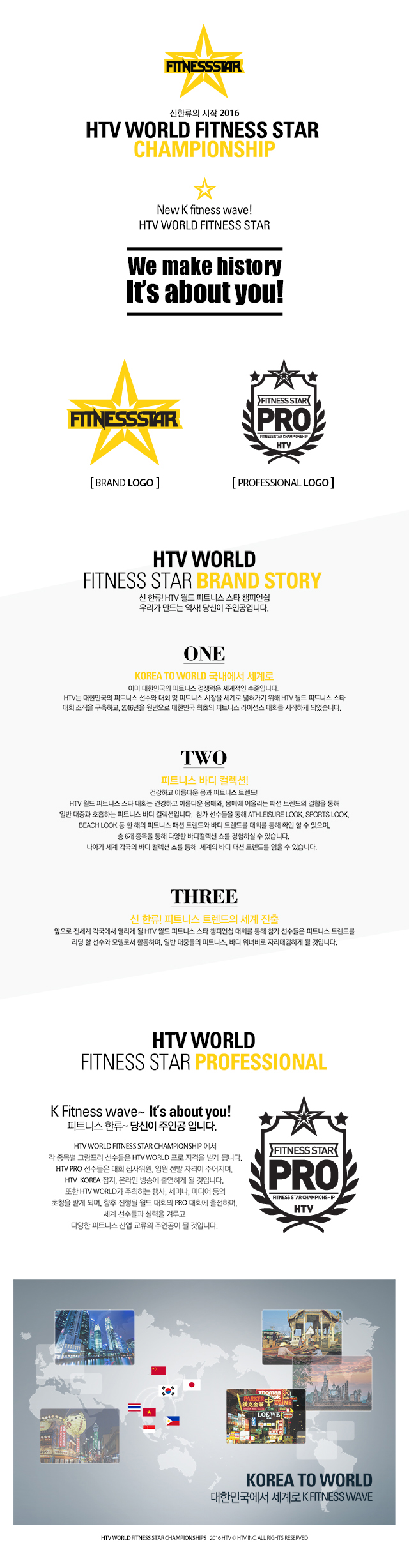 이미 대한민국의 피트니스 경쟁력은 세계적인 수준입니다. HTV는 대한민국의 피트니스 선수와 대회 및 피트니스 시장을 세계로 넓혀가기 위해 HTV 월드 피트니스 스타 대회 조직을 구축하고, 2016년을 원년으로 대한민국 최초의 피트니스 라이선스 대회를 시작하게 되었습니다.