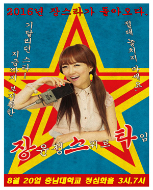 공 연 명 : 2016 장윤정콘서트「스위트 타임」- 대전공연 공연일시 : 2016년 08월 20일(토) 총1일 2회 토요일 - PM 3:00, 7:00 공연장소 : 충남대학교 정심화홀 티켓금액 : VIP_110,000 / R_99,000 / S_88,000 / A_77,000 관람등급 : 만7세 이상 관람시간 : 120분