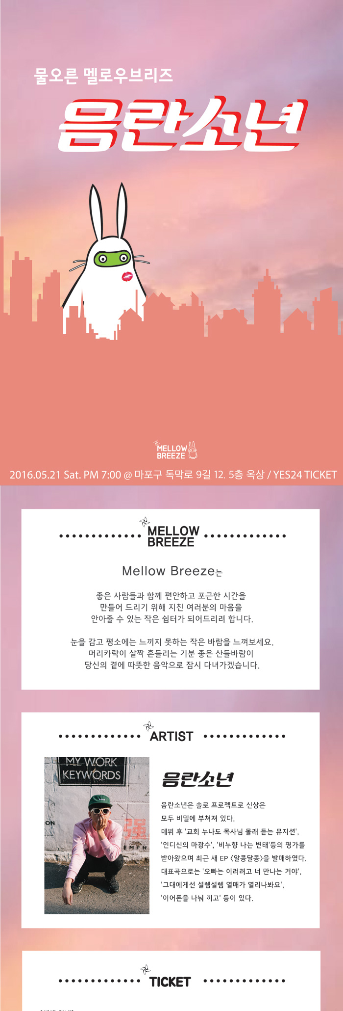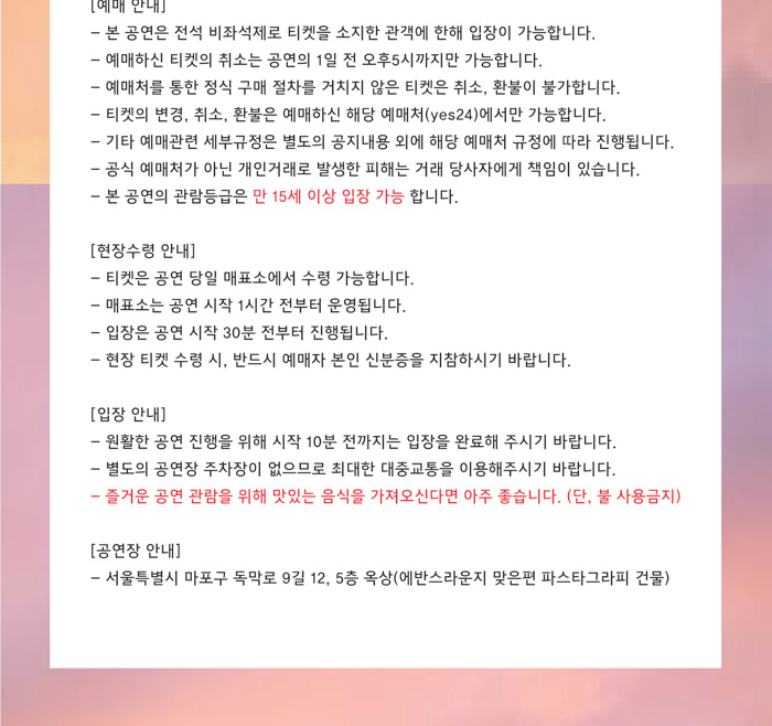 공연 기간 : 2016년 5월 21일(토) 공연 시간 : 저녁7시 공연 장소 : 마포구 독막로9길12 5층 옥상 (에반스라운지 맞은편 파스타그라피 건물) 티켓 가격 : 25,000원