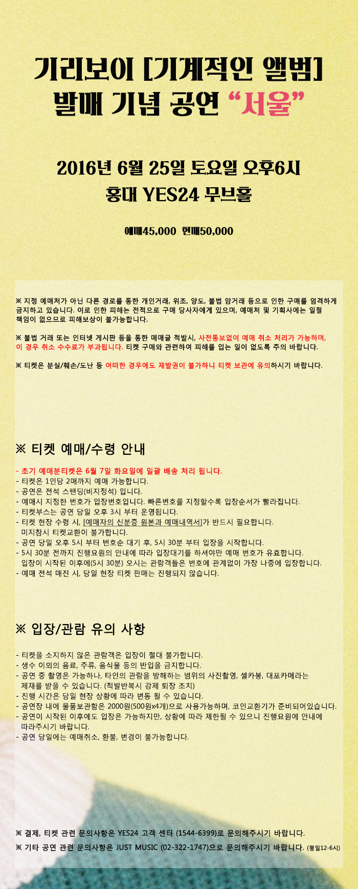 공연 기간 : 2016년 6월 25일 토요일 공연 시간 : 오후 6시 공연 장소 : 예스24무브홀 티켓 가격 : 예매 45.000 현매 50.000 (매진 시 진행X) 관람 시간 : 약 80분 관람 연령: 만 12세 이상