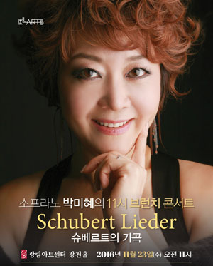 공연소개 소프라노 박미혜가 들려주는 이야기가 있는 브런치 콘서트. “맑고 영롱한 목소리를 가지고 가슴으로 노래하는 소프라노”라는 수식어가 말해주듯, 대한민국 최고의 프리마돈나 박미혜가 광림아트센터와 함께 2016년 하반기, 이야기가 있는 브런치 콘서트를 준비했다. 9월과 11월, 12월에 매회 다른 주제로 대중들의 귀에 익숙한 레퍼토리를 박미혜의 해설과 함께 국내 최고의 성악가들의 목소리로 들을 수 있다. 9월, “나폴리의 노래”를 시작으로, 이번 11월에는 “슈베르트의 가곡”이라는 주제와 함께 4인의 성악가를 통해 슈베르트 가곡의 새로운 감동을 선사 할 것이다.