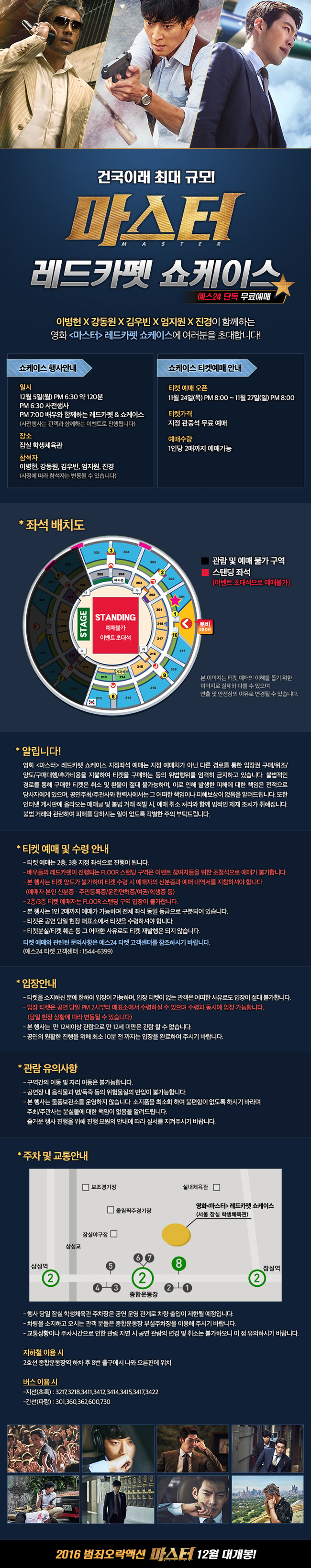 공연 제목 : <마스터> 레드카펫 쇼케이스 공연 기간 : 2016년 12월 5일 6시 30분 공연 시간 : 약 120분 공연 장소 : 잠실 학생체육관 티켓 가격 : 0원 (기타 : 만 12세이상 관람가)