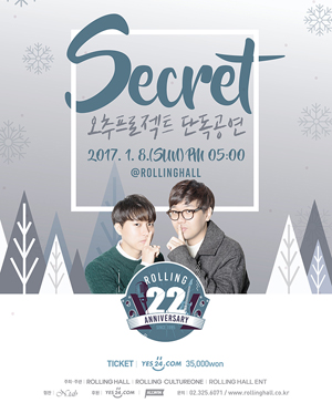 공연 제목 : 롤링 22주년 기념 공연 vol.2 오추프로젝트 단독 공연 [Secret] 공연 일시 : 2017년 1월 8일 (일) 오후 5시 공연 장소 : 롤링홀 공연 출연 : 오추프로젝트 티켓 가격 : 예매 35,000원 / 당일 현장구매 40,000원 러닝 타임 : 120분