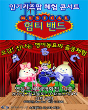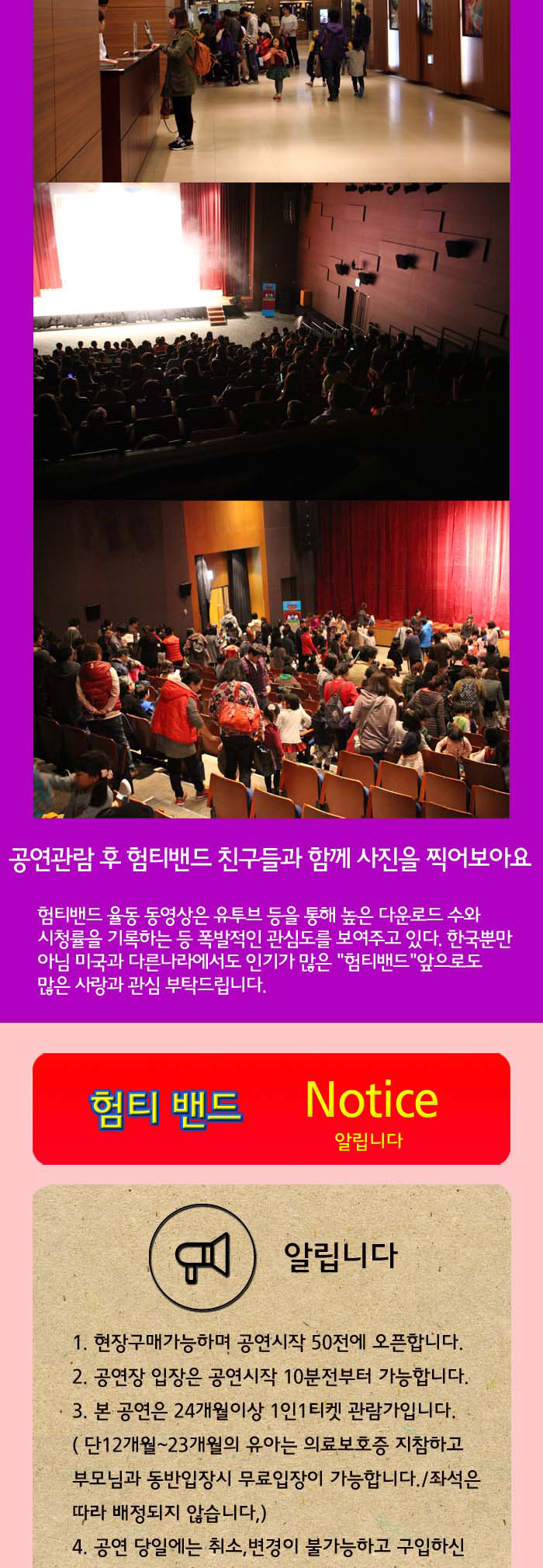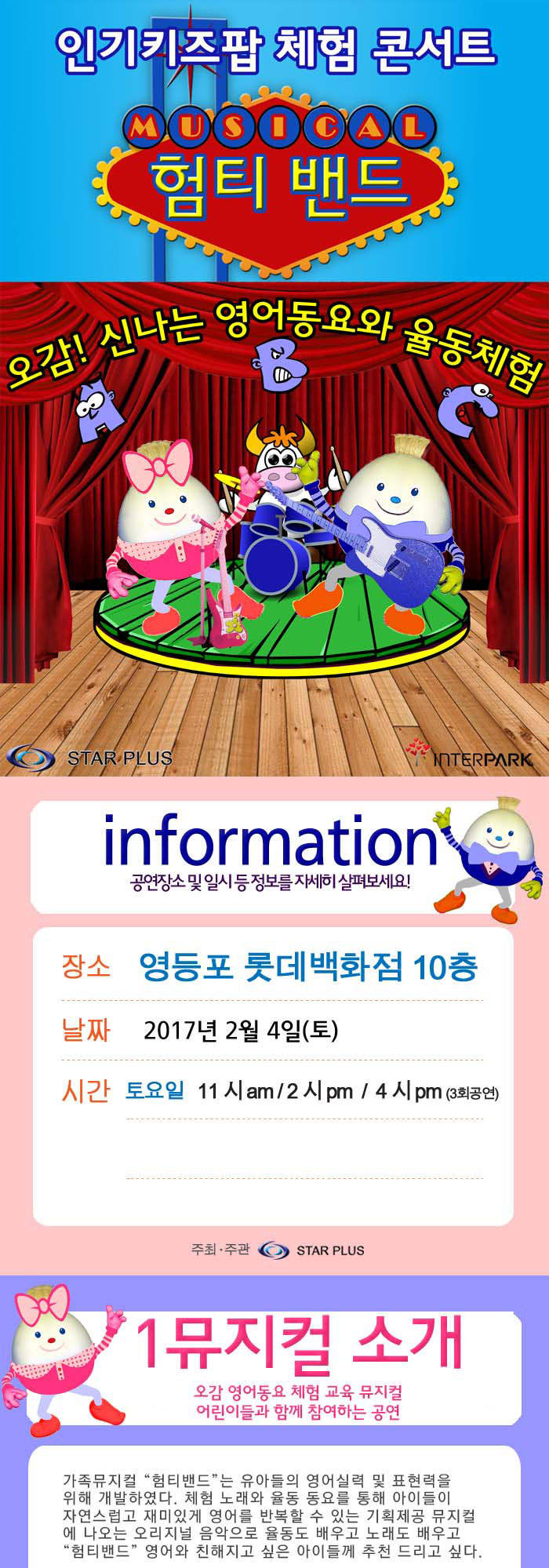 공연 제목 : 인기키즈팝 “험티밴드” 공연 기간 :2017년 02월04일 토 티켓오픈 공연기간 : (일정 기간 순차로 오픈 할 경우) 공연 시간 : 11시,2시,4시 공연 장소 : 영등포 롯데백화점 문화홀 티켓 가격 : 20000원