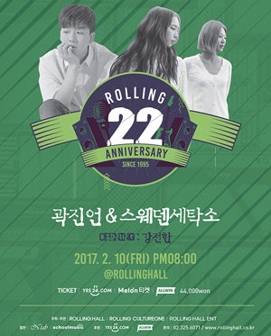 롤링 22주년 기념 공연의 아홉 번째 무대는 각자가 가진 분위기를 감성적인 음악으로 녹여내는 ‘곽진언’과 ‘스웨덴세탁소’의 공연입니다. 오프닝으로 싱어송라이터 ’강전한’도 함께합니다.