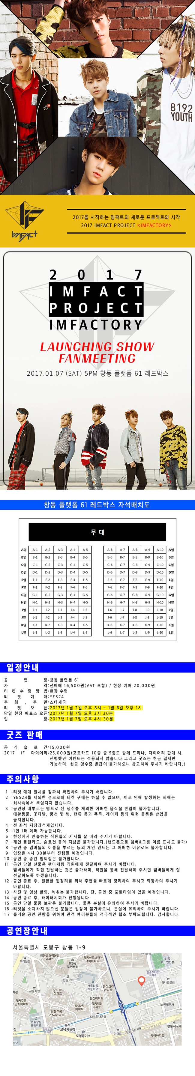 공연 제목 : 2017 임팩트 프로젝트 임팩토리 런칭쇼 공연 기간 : 2017년 1월 7일 토요일 오후 5시 공연 장소 : 플랫폼 창동 61 티켓 가격 : 전체 16,500원(VAT 포함) 관람 연령 : 36개월 이상 소요 시간 : 90분