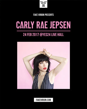 CARLY RAE JEPSEN(칼리 레이 젭슨) LIVE IN SEOUL ※ 공연 기간 : 2017년 2월 24일(금) ※ 공연 시간 : 7pm - 9pm ※ 공연 장소 : YES24 LIVE HALL ※ 티켓 가격 : 조기예매 66,000 예매 77,000, 현매 88,000 ※ 관람 연령 : 15세 이상가