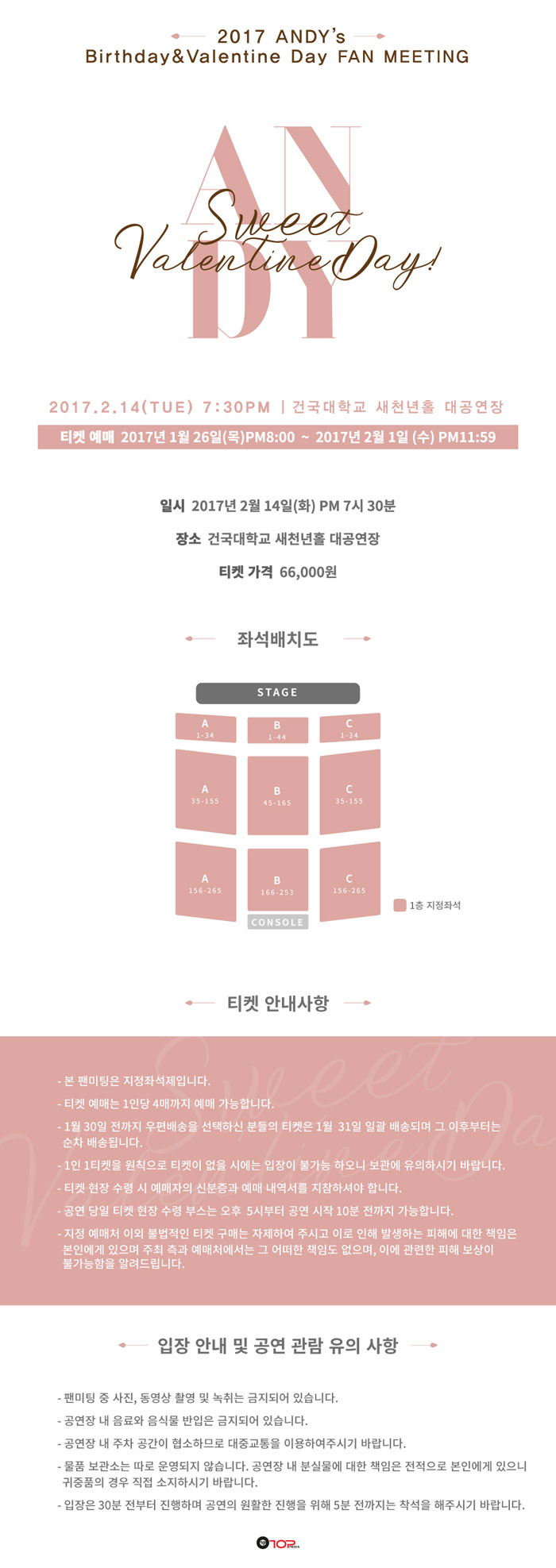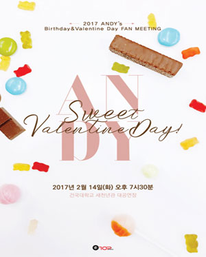 공연 제목 : 앤디's Birthday&Valentine Day 팬미팅 공연 기간 : 2017년 2월 14일 화요일 공연 시간 : PM 7:30 공연 장소 : 건국대학교 새천년관 대공연장 티켓 가격 : 66,000원