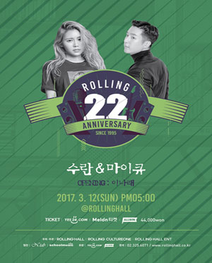 공연 제목 : 롤링 22주년 기념 공연 vol.21 수란X마이큐 공연 일시 : 2017년 3월 12일 (일) 오후 5시 공연 장소 : 롤링홀 공연 출연 : 수란, 마이큐 (오프닝_이나래) 티켓 가격 : 예매 44,000원 / 당일 현장구매 50,000원 러닝 타임 : 130분 (인터미션 10분)