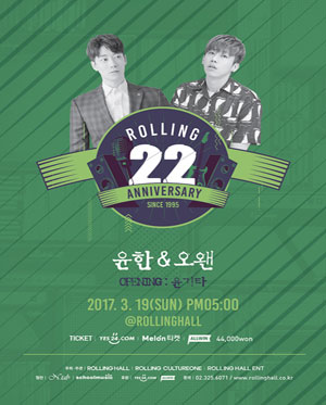공연 제목 : 롤링 22주년 기념 공연 vol.22 윤한X오왠 공연 일시 : 2017년 3월 19일 (일) 오후 5시 공연 장소 : 롤링홀 공연 출연 : 윤한, 오왠 (오프닝_윤기타) 티켓 가격 : 예매 44,000원 / 당일 현장구매 50,000원 러닝 타임 : 130분 (인터미션 10분)