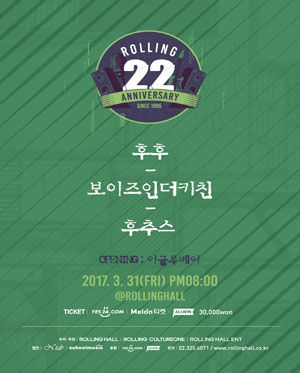 롤링 22주년 기념 공연 vol.26 후후X보이즈인더키친X후추스 티켓오픈안내입니다.