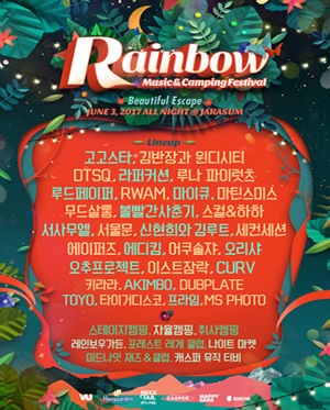 ‘레인보우 아일랜드 2017’ 는 산뜻한 초여름, 일상에서 벗어나 발걸음 가볍게 떠나는 것으로 시작합니다. 푸르른 녹음으로 둘러싸인 북한강 한 가운데 자리 잡은 자라섬에서 자연을 만끽하실 수 있습니다. 핫한 아티스트들의 공연과 숲 속에서의 캠프파이어를, 해질 무렵 자라섬에서 펼쳐지는 사랑에 대한 달달한 토크쇼를 즐겨보세요. 그리고 밤이 깊어지면 별을 보며 아름다운 기타 소리를 들어 보세요.