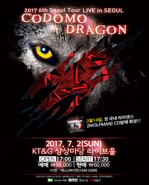 2015년 3월 첫 번째 내한공연 이후로 한일축제한마당 일본 팀 대표, 2016년 일본 팀 첫 라이브클럽데이 참가 등 뜨거운 열정으로 국내를 찾아온 코도모드래곤(Codomo Dragon)이 오는 7월, 6번째 내한을 한다. 파워풀하고 박력 넘치는 사운드로 많은 팬들에게 사랑 받고 있으며 2017년 3월 14일에 국내 첫 라이선스CD [WOLFMAN]이 발매된다.