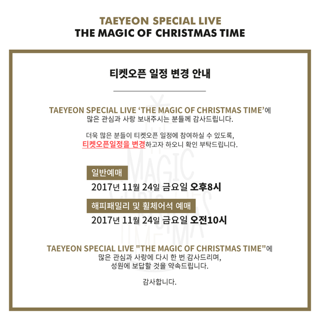 TAEYEON SPECIAL LIVE [The Magic of Christmas Time] 오픈일자 변경안내입니다.