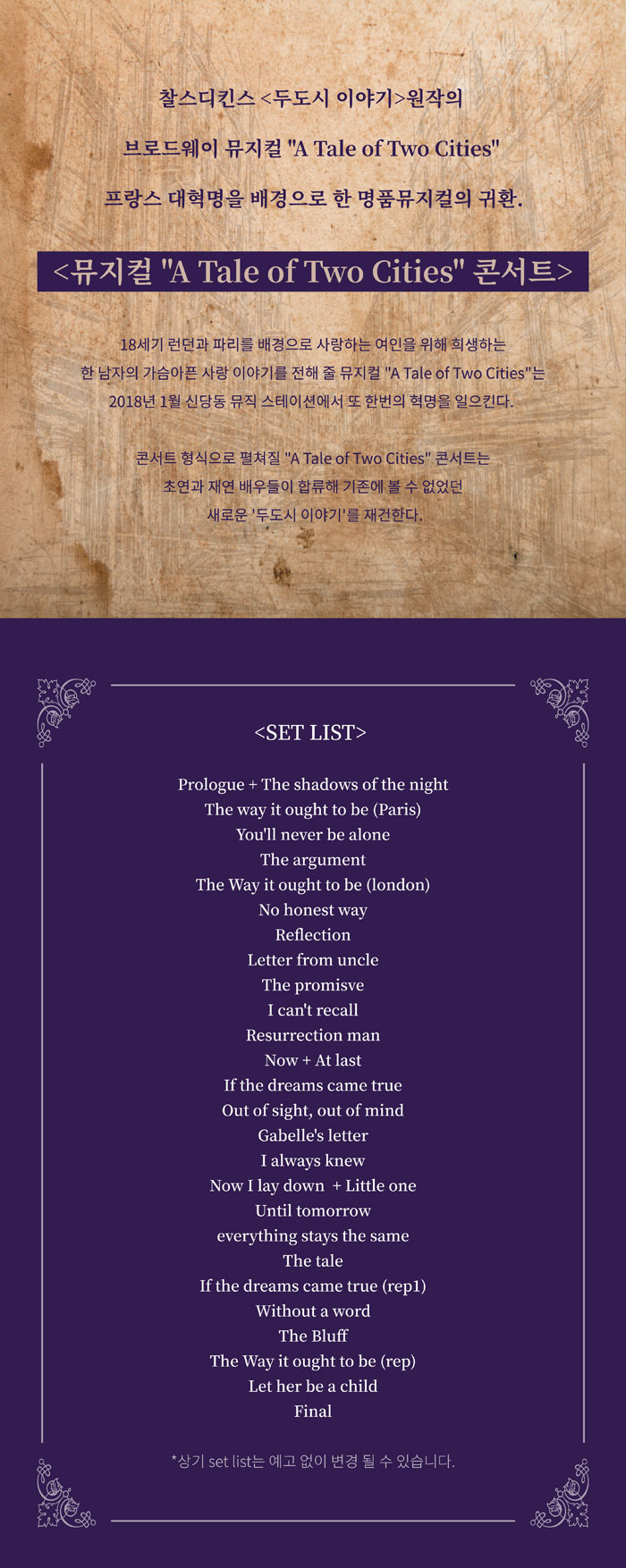 공연 기간 : 2018년 01월 29일 공연 시간 : 오후 8시 공연 장소 : 공감센터 티켓 가격 : VIP 77,000원 / R석 66,000원 관람연령: 8세 이상 관람시간: 2시간