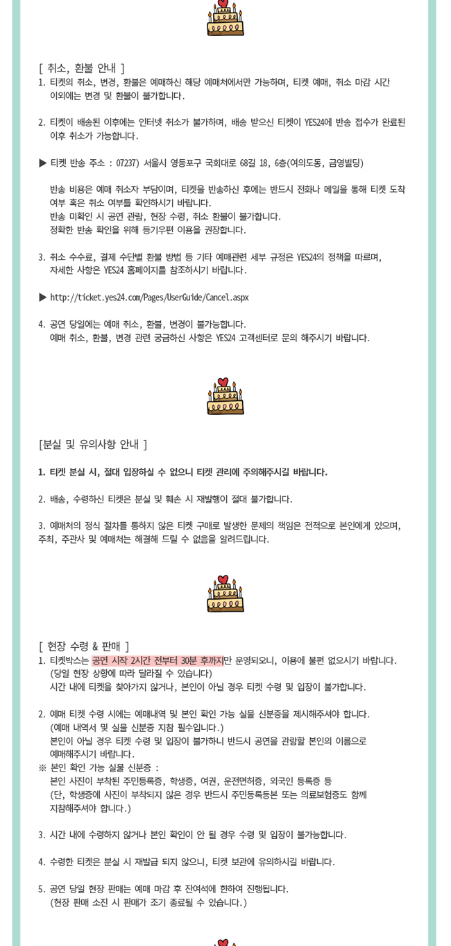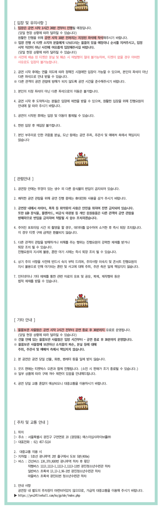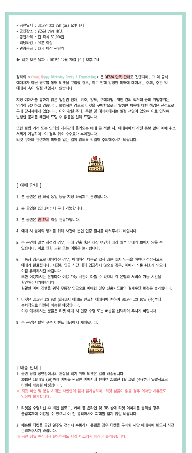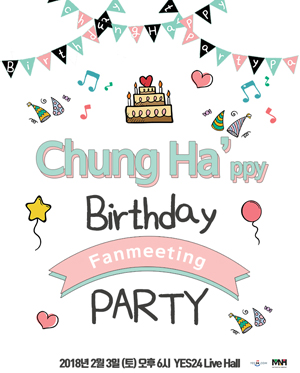 공연 제목 : Chung Happy Birthday Party & Fanmeeting 공연 기간 : 2018년 2월 3일 (토) 티켓오픈 : 2017년 12월 20일 (수) 공연 시간 : PM 6:00 공연 장소 : YES24 Live Hall 티켓 가격 : 전 좌석 50,000원 관람연령 : 만 12세 이상 관람가