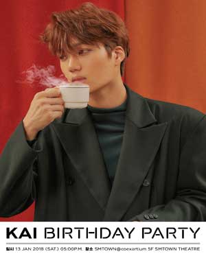 공연명 : 2018 KAI ☆ Birthday Party!! 일 시 : 2018년 1월 13일 (토) PM 05:00 (예정) 장 소 : SMTOWN@coexartium 5F SMTOWN THEATRE