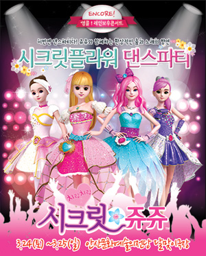 공연 제목 : 시크릿 쥬쥬 - 시크릿플라워 댄스파티 - 안산 공연 기간 : 3. 24(토) ~25(일) 공연 시간 : (토) 11시,2시,4시 (일) 11시,2시 공연 장소 : 안산문화예술의전당 달맞이극장 티켓 가격 : R석 50,000원 S석 40,000원 관람등급 : 24개월이상 유료관람(기준일 2016. 4. 24 이전출생), 24개월 미만 입장불가