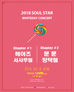 공연 제목 : ‘SOUL STAR’ Concert - 헤이즈, 장덕철, 서사무엘 공연 기간 : 2018.3.10 공연 시간 : 오후6시 공연 장소 : yes 24 live hall 티켓 가격 : 스탠딩R석-66,000원, 스탠딩S석-44,000원, 지정석-66,000원