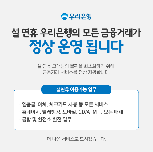 우리은행의 모든 금융거래 정상 운영되오니 업무에 착오없으시기 바랍니다.