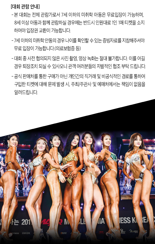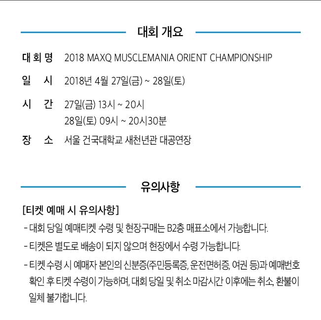 공연 제목 : 2018 MAXQ MUSCLEMANIA ORIENT CHAMPIONSHIP 공연 기간 : 2018년 4월 27일(금)~28일(토) 공연 시간 : 22일(금) 13시~20시 / 23일(토) 9시~20시30분 공연 장소 : 건국대학교 새천년관 대공연장 티켓 가격 : 24,000원