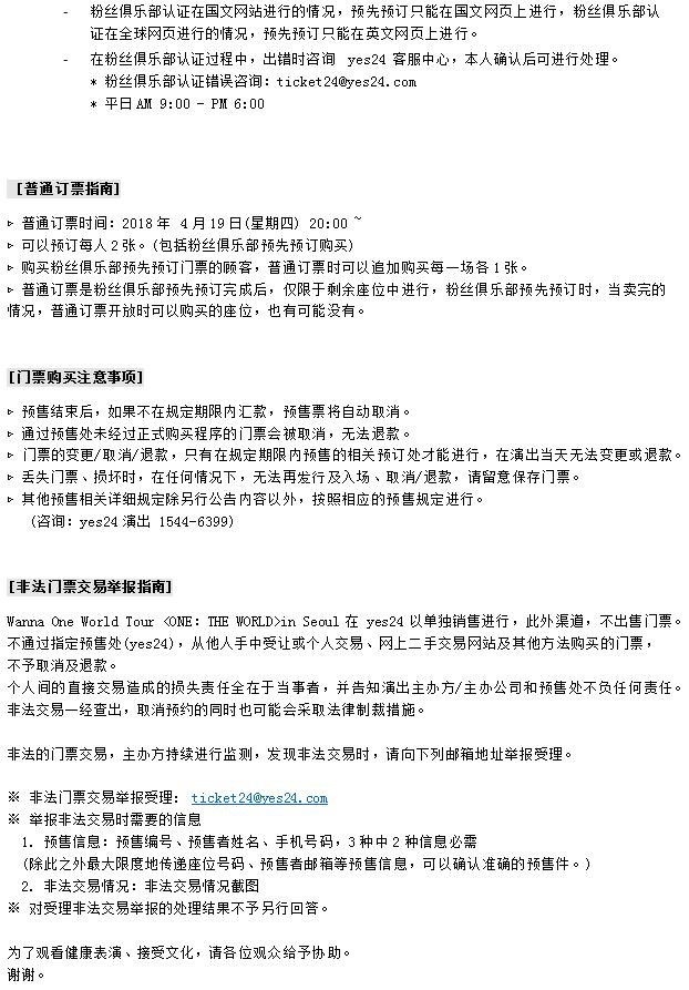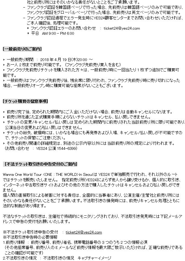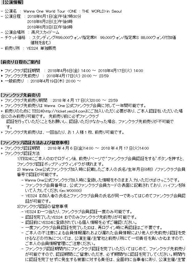 Tickets for the Wanna One World Tour in Seoul are exclusively available from YES 24 and unavailable through any other routes. Accordingly, tickets transferred from other people or purchased through individual transactions, an internet second-hand trade site, or other means, not through the designated place of booking (YES 24), cannot be canceled or refunded.