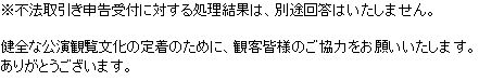 The persons directly involved shall take entire responsibility for any damage arising from a direct transaction between individuals and the host and supervisor of the performance and the ticket seller do not bear any responsibility for such. An illegal transaction that is uncoverd is subject to the cancellation of such booking as well as legal limitations.