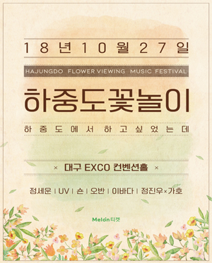 공연 제목 : 뮤직페스티벌 - 하중도꽃놀이 공연 기간 : 2018년 10월 27일 토요일 - 대구exco 컨벤션센터 공연 시간 : 10월27일 토요일(오후6시) 공연 장소 : 대구exco 컨벤션센터 티켓 가격 : R 66,000 / S 55,000 / A 44,000 관람연령,: 11세이상 관람시간 :180분