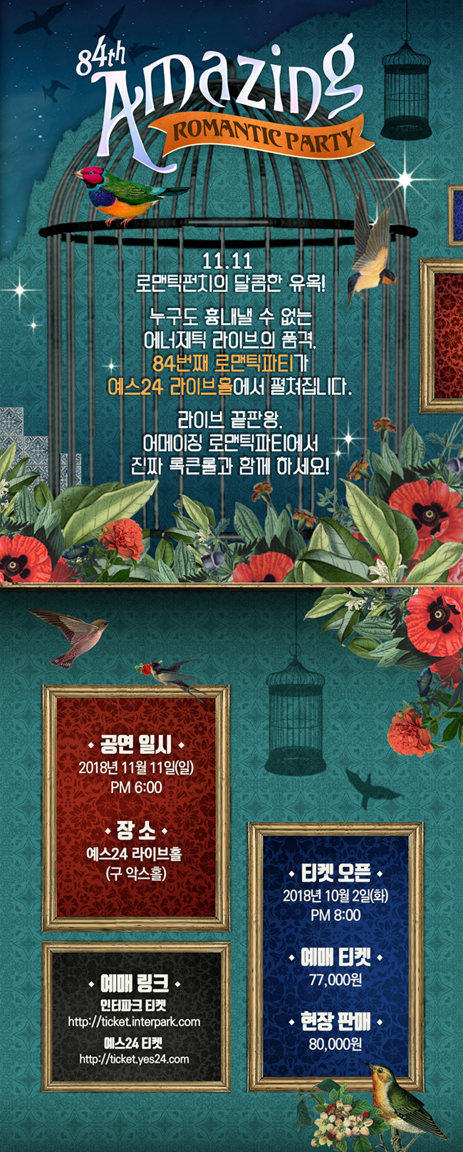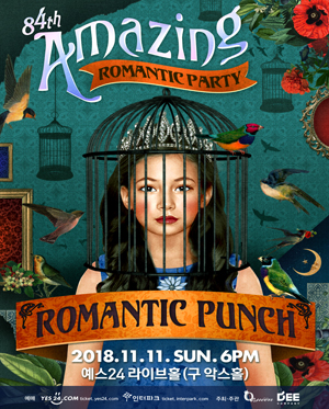 공연 제목 : 로맨틱펀치 단독공연 (84번째 로맨틱파티 “AMAZING”) 공연 기간 : 2018.11.11 티켓오픈 공연기간 : 2018.10.2 공연 시간 : PM 6:00 공연 장소 : 예스24 라이브홀 티켓 가격 : 77,000원